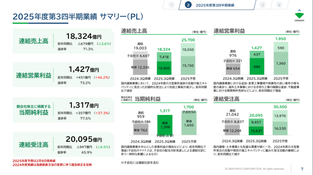 | 大林組 (1802) | 海外事業の拡大、技術力 | 国内建設事業の受注減 |