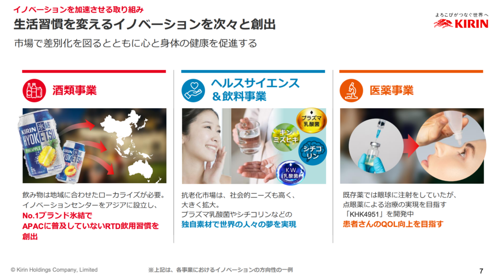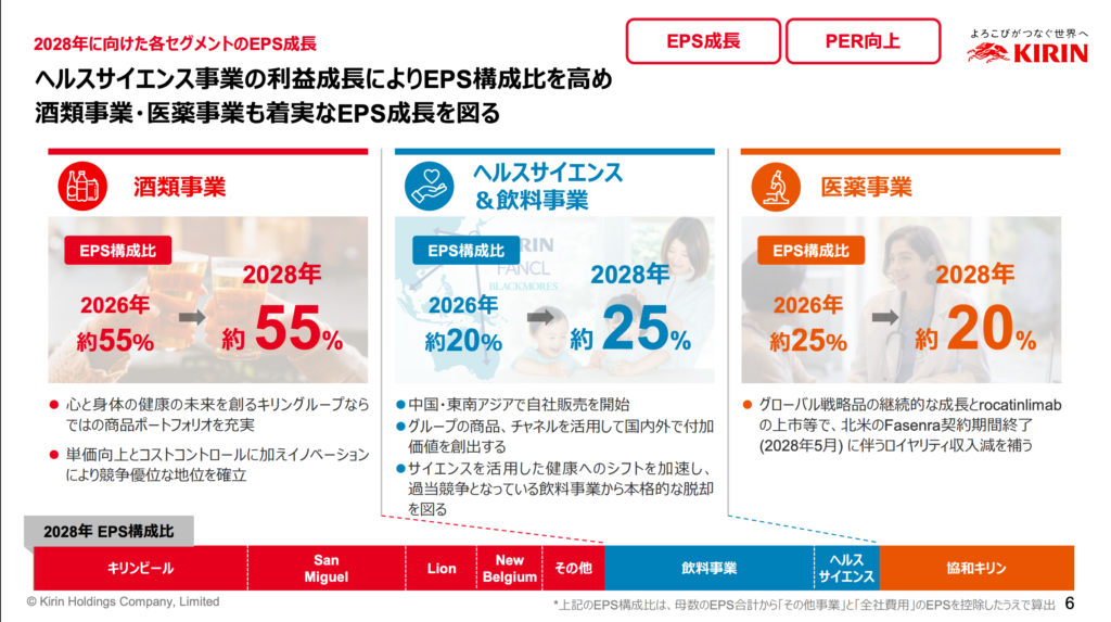資料には「2028年に向けて、ヘルスサイエンス事業の利益成長によりEPS構成比を高める」とある。しかし、裏を返せば「酒と薬じゃ、これからの時代、稼げねえ!」という悲痛な叫びが聞こえてくるようだ。まあ、時代の変化に対応するのは当然。経営判断としてはアリだ。